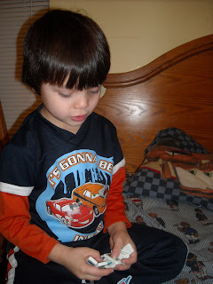 I was at home from work today and went out to the grocery store for a bit. John is at home with a hurt foot and so Kyle was just playing in the den. When I got home I see this: